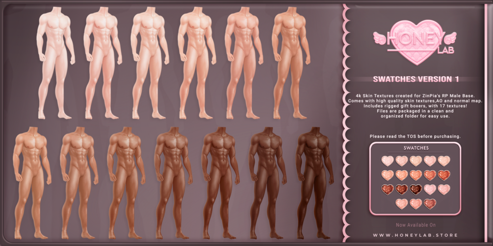 Honeylab Skin Texture Pack includes 39 textures in total for 1 version. 78 textures in total for full pack.